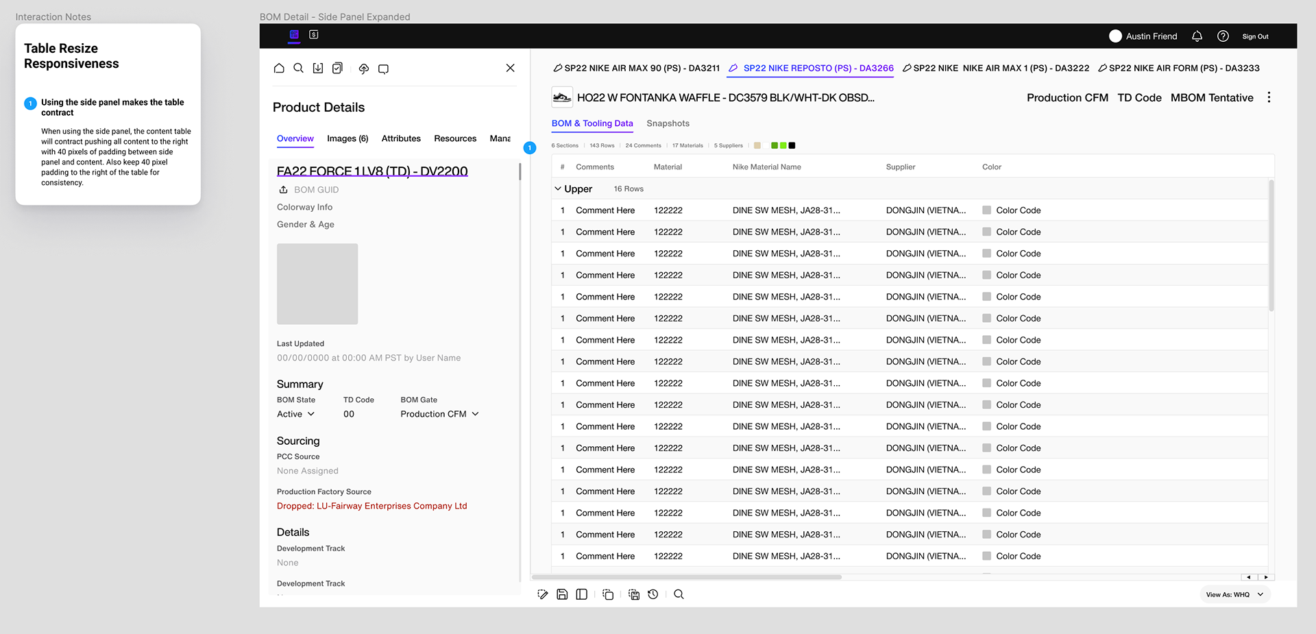 The goal of this digital tool is to allow our Tech Devs to see a line-by-line online living document that communicates the ordering of component-level footwear specifications to Nike's partner manufacturing factories overseas.