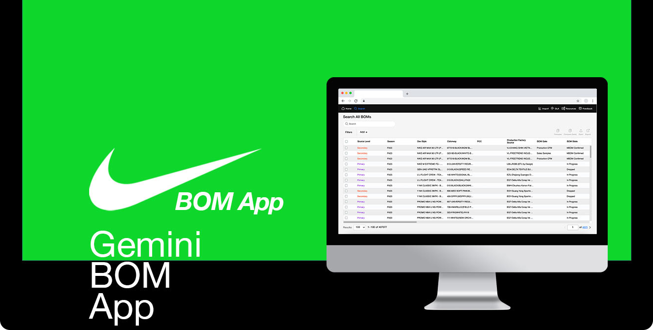 The Gemini - BOM (Bill of Materials) App supports our Footwear Technical Developers (aka Tech Devs) at Nike.