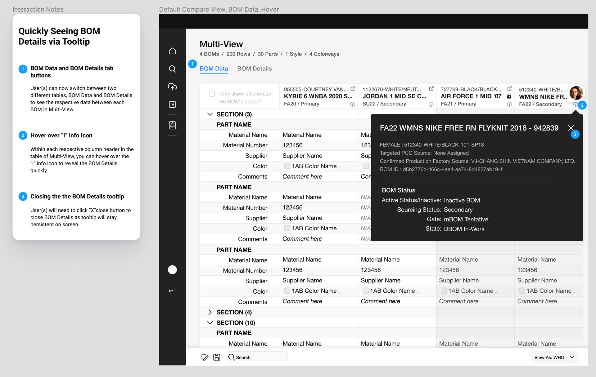 With new research I conducted, users wanted a quicker way to see key BOM data. I explored utilizing a tooltip with a hover over on an "i" icon. With conversations with my product managers and engineering, this was a quick and easy way to implement this feature in the tool fairly quickly.