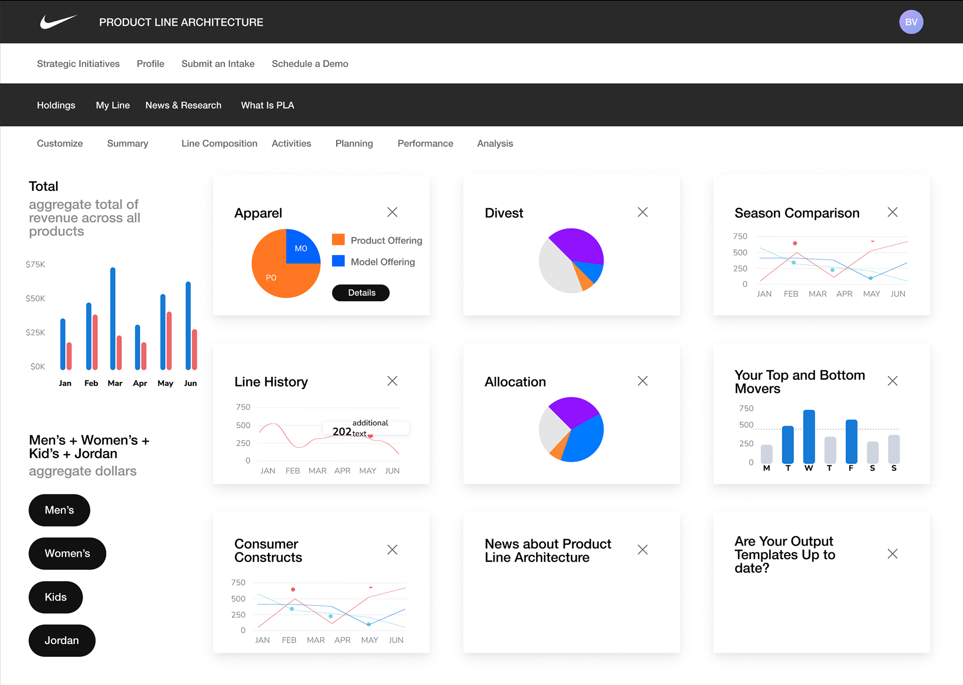 The Product Line Architecture (PLA) project began for a need to easily digest financial data about physical Nike products in the merchandising space.